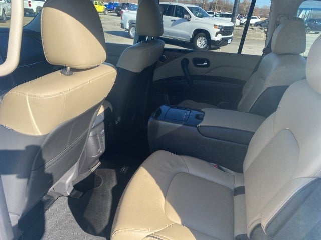 ** Alloy Wheels / Premium Wheels, ** Bluetooth®, Hands Free, ** Cruise Control, ** Keyless Entry, ** Premium Sound System / Premium Audio, ** Satellite Radio, ** Steering Wheel Controls, 13 Speakers, 2.937 Axle Ratio, 3rd row seats: split-bench, 4-Wheel Disc Brakes, ABS brakes, Air Conditioning, Alloy wheels, AM/FM radio: SiriusXM, Anti-whiplash front head restraints, Auto High-beam Headlights, Auto tilt-away steering wheel, Auto-dimming door mirrors, Auto-dimming Rear-View mirror, Auto-leveling suspension, Automatic temperature control, Brake assist, Bumpers: body-color, Cargo Net, Cargo Package, Carpeted Cargo Mat, Center Console Tray, Compass, Console Net, Delay-off headlights, Driver door bin, Driver vanity mirror, Dual front impact airbags, Dual front side impact airbags, Electronic Stability Control, Emergency communication system: INFINITI InTouch, First-Aid Kit, Four wheel independent suspension, Front anti-roll bar, Front Bucket Seats, Front Center Armrest, Front dual zone A/C, Front fog lights, Front reading lights, Fully automatic headlights, Garage door transmitter: HomeLink, Heated door mirrors, Heated Front Bucket Seats, Heated front seats, Heated steering wheel, Illuminated entry, INFINITI Radiant Illuminated Kick Plates, Leather Shift Knob, Leather steering wheel, Leather-Appointed Seats, Literature Kit, Low tire pressure warning, Memory seat, Midyear Change, Navigation system: INFINITI InTouch Navigation, Occupant sensing airbag, Outside temperature display, Overhead airbag, Overhead console, Panic alarm, Passenger door bin, Passenger vanity mirror, Power door mirrors, Power driver seat, Power Liftgate, Power moonroof, Power passenger seat, Power steering, Power windows, Premium audio system: Bose, Premium Select Sahara Stone Interior, Radio data system, Radio: Bose Premium Audio System w/13 Speakers, Rain sensing wipers, Rear air conditioning, Rear anti-roll bar, Rear reading lights, Rear seat center armrest, Rear window defroster, Rear window wiper, Reclining 3rd row seat, Remote keyless entry, Roof Rail Cross Bars, Security system, Speed control, Speed-sensing steering, Split folding rear seat, Spoiler, Steering wheel memory, Steering wheel mounted audio controls, Tachometer, Telescoping steering wheel, Tilt steering wheel, Traction control, Trip computer, Turn signal indicator mirrors, Variably intermittent wipers, Voltmeter, Wheels: 22 x 8.0 Dark Chrome Cast Aluminum-Alloy. Recent Arrival! Moonstone White 2023 Clean CARFAX. INFINITI QX80 4D Sport Utility Premium Select 5.6L V8 7-Speed Automatic 4WD